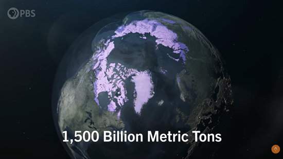 (図1)現在、北極圏の永久凍土に閉じ込められている炭素の総量は、1,500〜2,200GtCであり、大気中炭素量(約880GtC)の2〜3倍である。その10%が融解するだけで、全世界の平均気温が0.5℃近く上昇する。