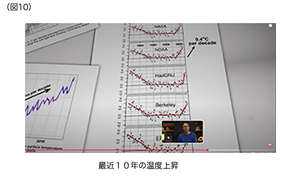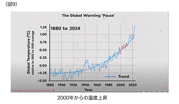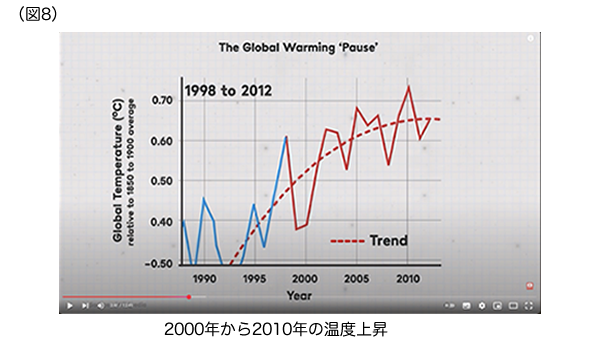 これまでも短期的な傾向を見て、多くの人が判断を間違うケースもありました。例えば、2000年から2010年までの傾向を見て、地球温暖化は終わったという人がかなりいました。(図8)しかし今では、その期間は温暖化の小休止だったことが分かっています。(図9)