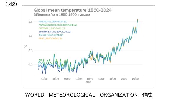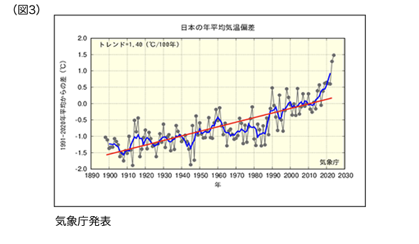 パリ協定、グラスゴー合意などで世界は地球の気温上昇を、産業革命前と比較して可能な限り1.5度までに止めようと合意をしています。しかしながら、一昨年、昨年、そして今年と、三年連続して、日本、そして世界は、かつてない高温の夏、猛暑の夏を経験しました。この三年の気温上昇だけで0.4℃を超えます。このため世界の気温上昇は単年度では2024年に1.5℃をこえてしまいました。(図2)(図3)
