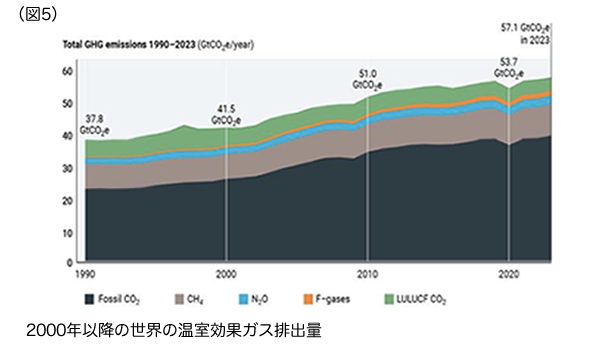 世界の気温上昇と、温室効果ガスの排出量はほぼ比例しているといわれていますので、1990年から2023年までの温室効果ガスの排出量のグラフを見てみます。黒い部分がCO2です。(図5)2010年代後半から増加傾向が小さくはなっていますがまだフラットにはなっていません。世界の気温上昇と、温室効果ガスの排出量はほぼ比例しているといわれています。この排出量を前提にすると、現在の気温の中長期的な上昇は、温室効果ガスの排出量で説明できるとされています。ただ、この最近の10年の温暖化の加速については、完全に説明出来ず、何か新しい要因で温度上昇が加速した可能性もあると、専門家が述べています。それが北極圏周辺の永久凍土層からのメタンの噴出なのか、それ以外の原因なのか、まだ調査中です。