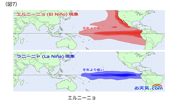 この状況は去年から今年がピークでこの影響は今後小さくなっていきます。もう一つの原因が最近まで続いたエルニーニョの影響です。エルニーニョとは、ペルー沖の太平洋で、普通の時期には深い海から湧きだしている冷たい海流が止まって、海面が広範囲に熱くなる現象です。地球全体の気温の上下に影響することが分かっています。(図7)